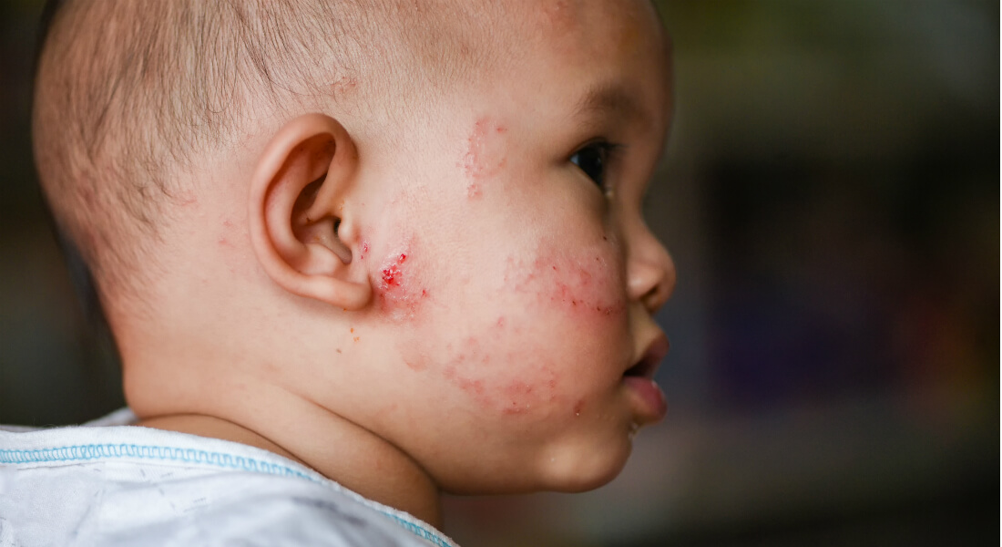 About 20 percent of all children develop atopic dermatitis at varying levels of severity. The disorder appears as a red rash with dry, itchy skin that may sometimes ooze fluid. Most children outgrow the disease. For two out of three, the eczema disappears before they reach puberty.