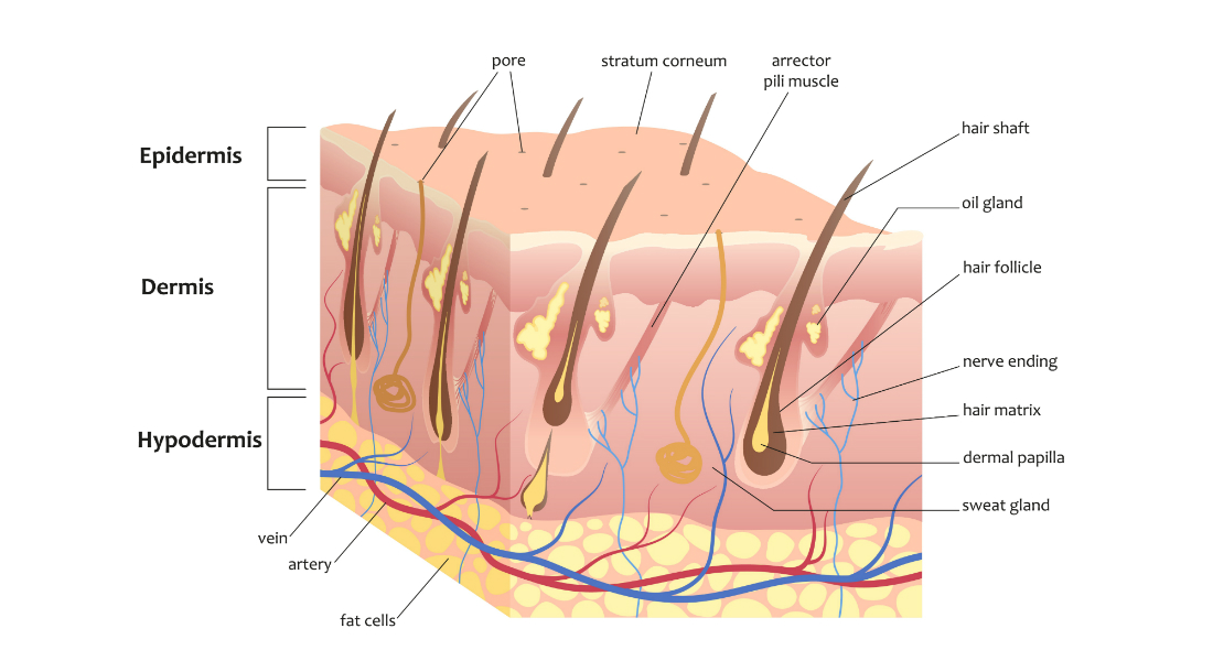 The skin acts as the body's barrier against the outside world and protects the body's interior. At a rate of 30,000 cell divisions per minute, it constantly renews itself. This means that the outer skin layer, the epidermis, completely replaces itself in about a month.